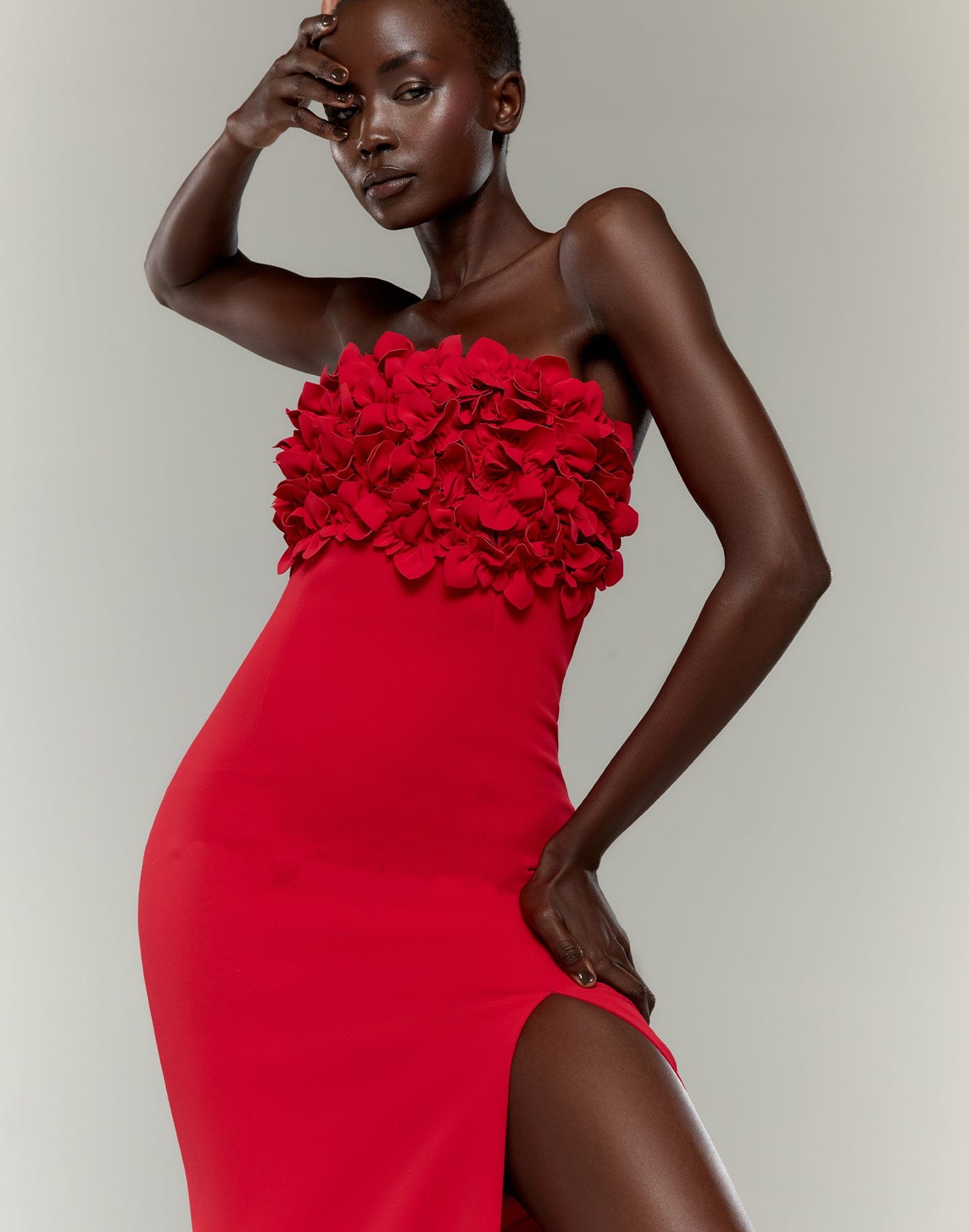 Classic choices include deep jewel tones like ruby red and emerald green, often paired with sophisticated neutrals such as charcoal grey, silver, or black. Our JASMINE Red Dress is a vision with its 3D floral-embroidered ruffles, and SAMANTHA carefully contrasts a silver sequin bodice with a black velvet skirt to create a truly unforgettable dress.