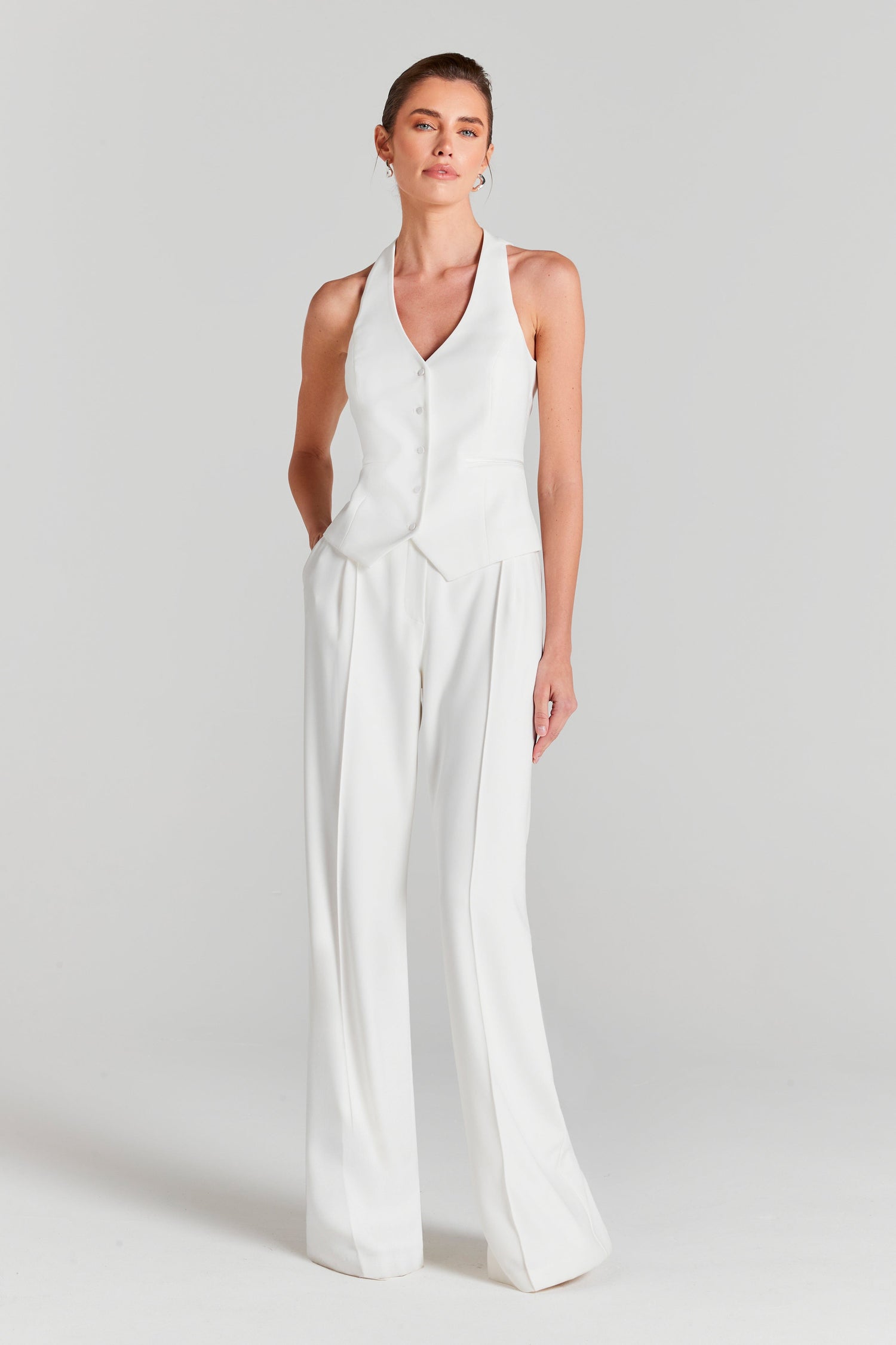 For the bride looking for a touch of sophisticated minimalism on her big day, look no further than the LENI White Waistcoat and CAMERON White Pants. Crafted from our signature crepe fabrication, the waistcoat features silhouette-enhancing seam detailing and a halter neckline. The CAMERON White Pants feature a relaxed, wide-leg silhouette for enhanced comfort on your big day.