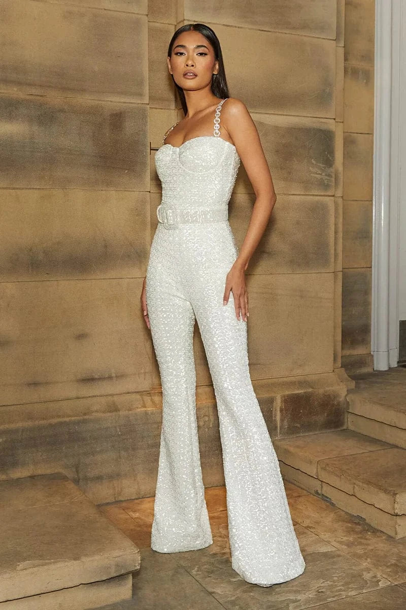 A jumpsuit is an incredibly chic and comfortable option for a vow renewal. It offers a sleek silhouette, often with elegant details, such as wide-leg trousers, like the LUCINDA White Jumpsuit and its sequined fabrication, or intricate lace sleeves, like our MARISSA Black Jumpsuit.