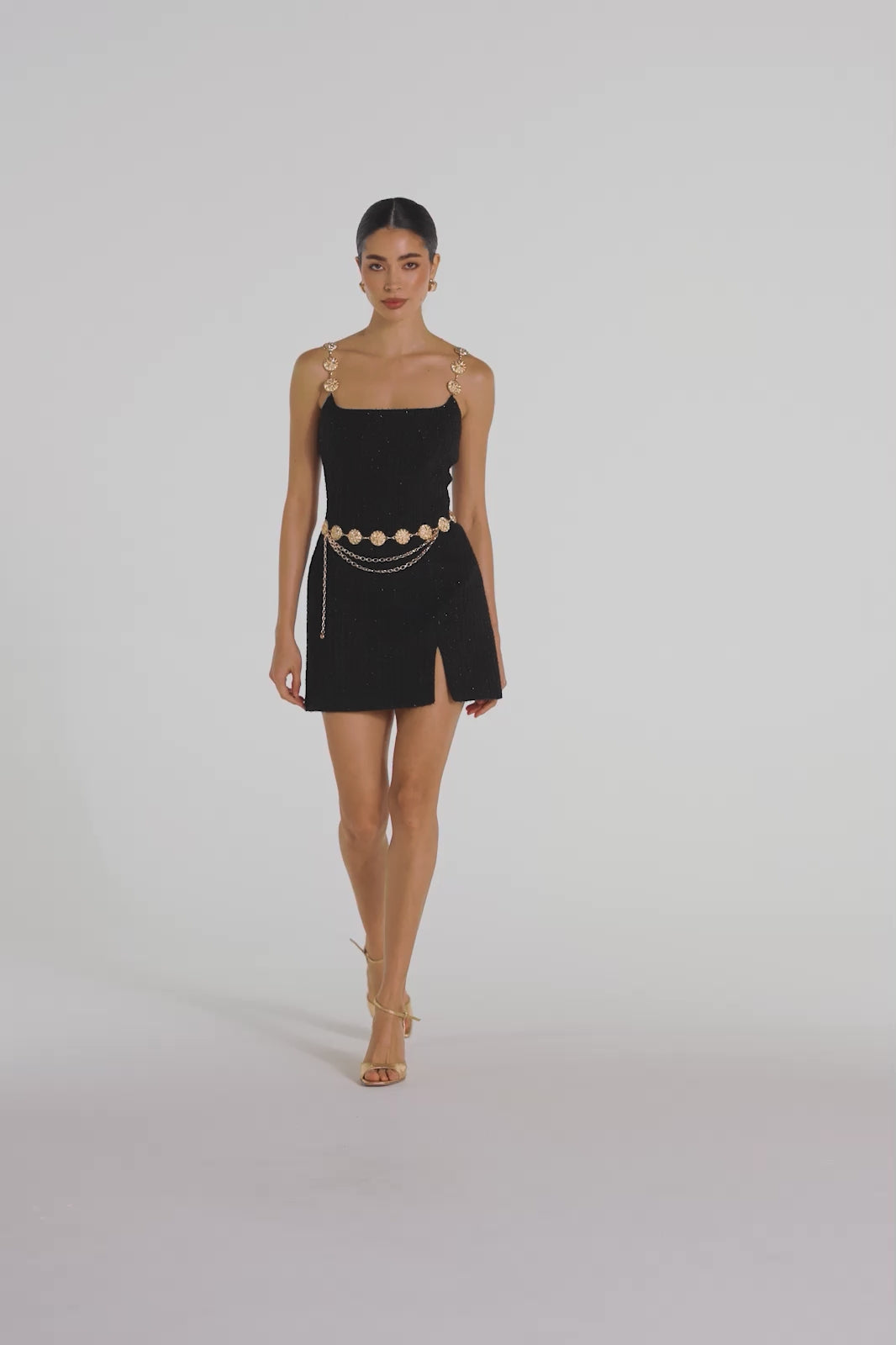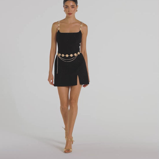 The ALEX Black Dress is crafted from black bouclé-tweed with a shimmer thread running through and features a sculpted fitted silhouette with slit detailing for added edge. The square neckline at the front and V-back create a flattering contrast, while seam detailing throughout enhances the figure. Embossed circular chain straps add a bold touch, with elasticated backs for comfort and ease. Style it with or without the detachable layered coin adorned chain belt for a refined flair.
