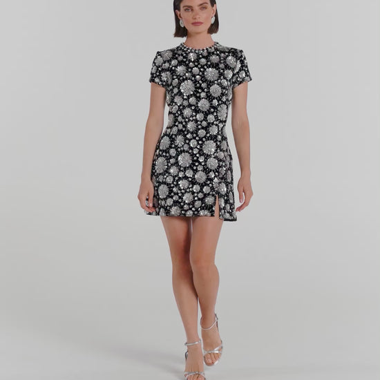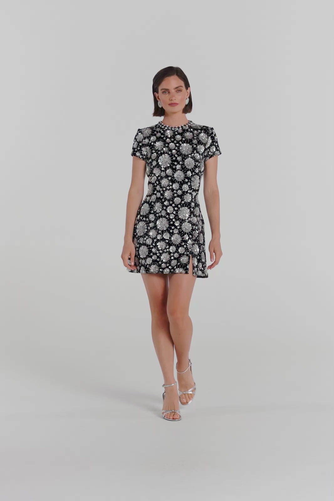 The EVIE Dress is crafted from our exclusive black velvet fabrication and is adorned silver constellation embroidered detailing throughout. Featuring a high round neckline with jewel trim, t-shirt bodycon mini silhouette, and slight slit at front. Fully lined with a concealed zip closure at back.