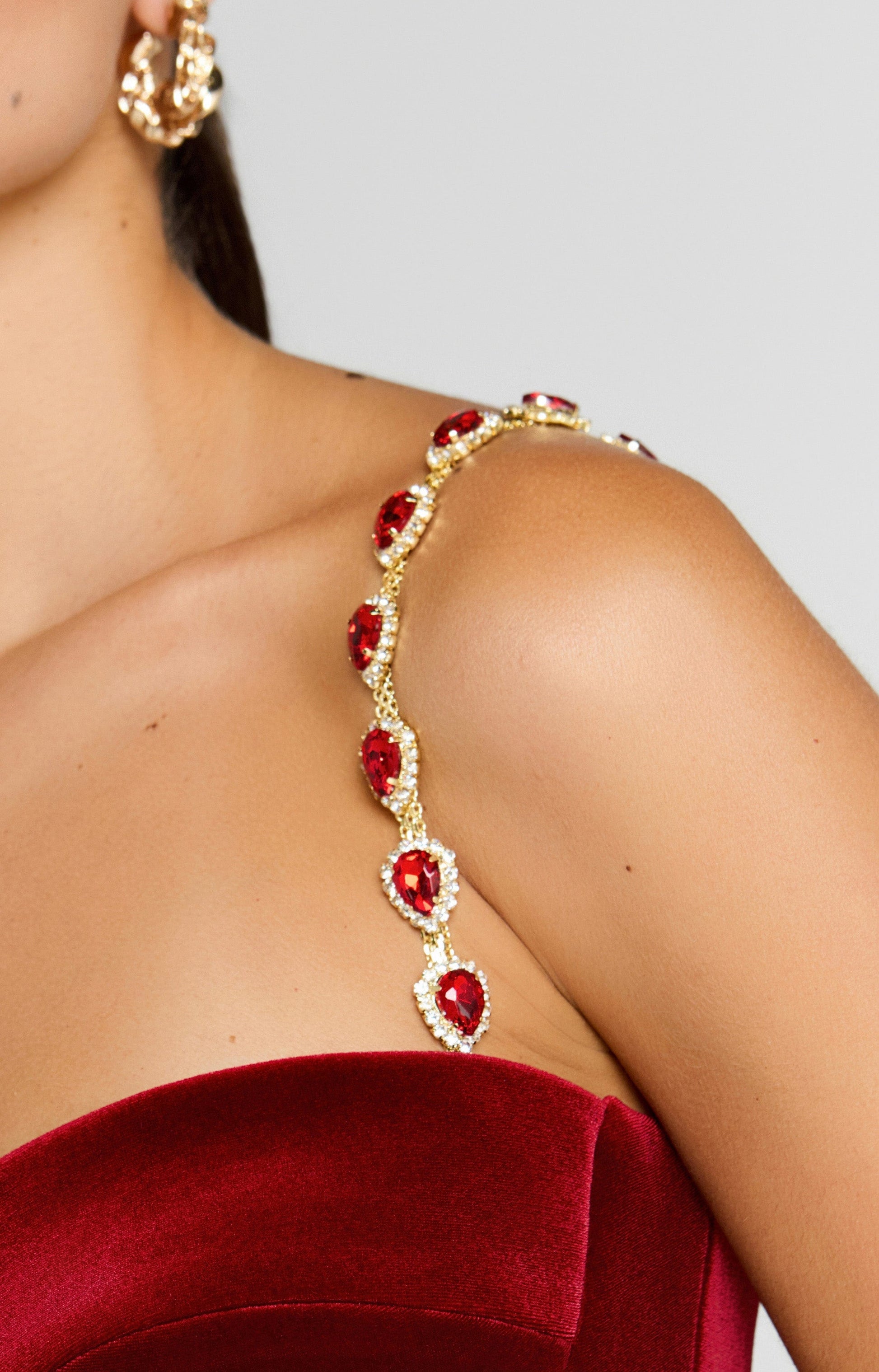 Crafted from luxurious red velvet, the HARLEY Dress features a corset-style boned bodice and our signature tulip mini skirt for a cinched, sculpted silhouette. Gold detachable straps with red jewel embellishments offer adaptable elegance, while a concealed centre-back zip ensures a smooth fit. Fully lined for comfort and structure.