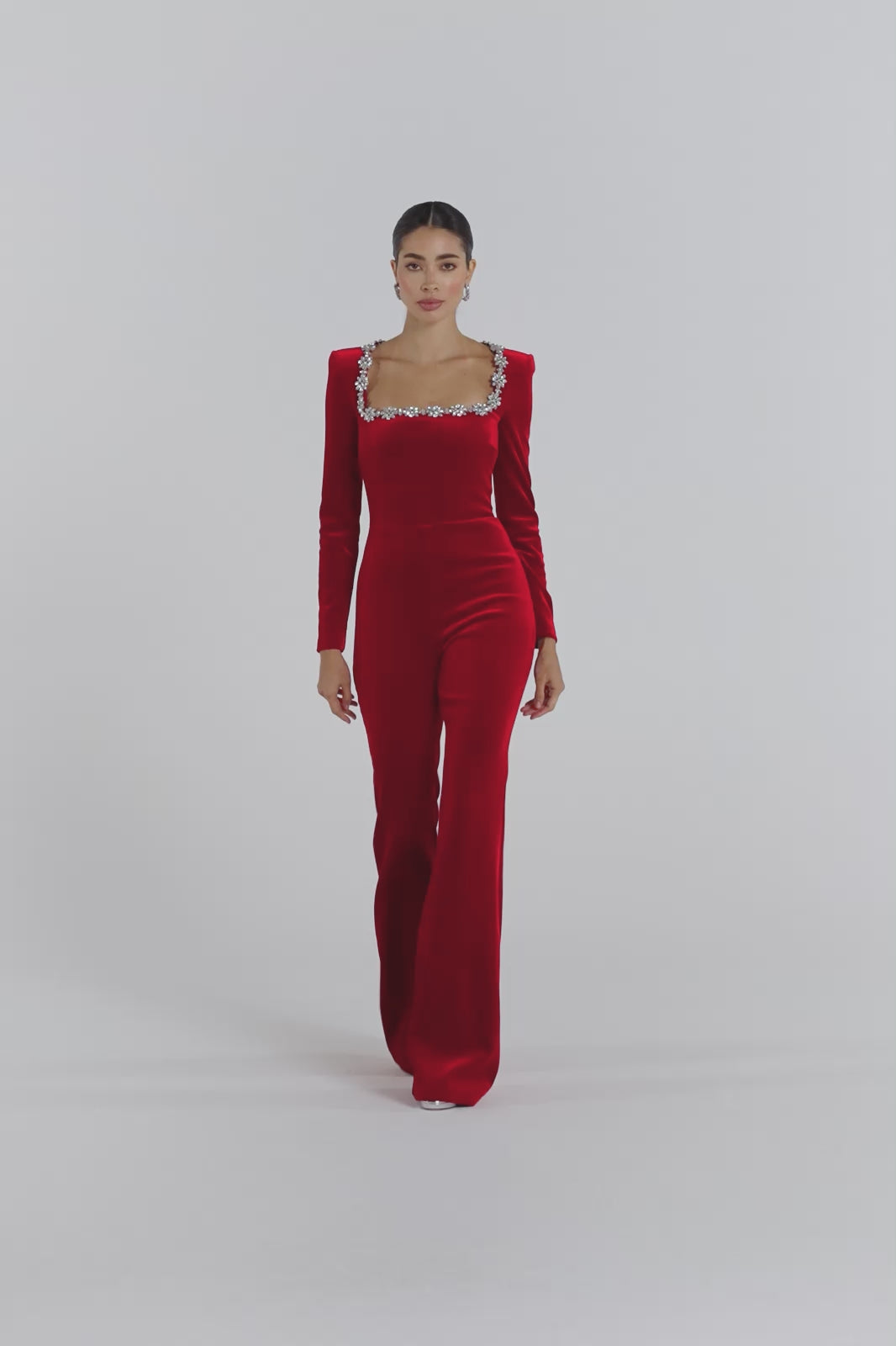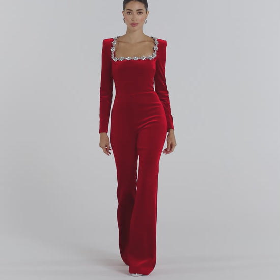 The KIMBERLY Red Jumpsuit is crafted from an exclusively designed red velvet fabrication, elevated with an embellished square neckline for a touch of opulence. Structured with an internal corset bodice and boning to sculpt the silhouette, the design is finished with padded shoulders, long sleeves, and our signature flared legs for a balanced shape. A concealed zip closure at the back ensures a smooth fit.