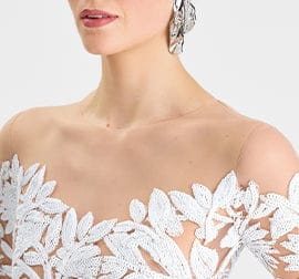 The MELISSA White Dress is crafted from sheer nude mesh, intricately adorned with white leaf sequin embellishments. Each placement is thoughtfully designed to create the perfect balance of coverage and allure, for every step of your bridal journey. Featuring an off-the-shoulder neckline, full-length sleeves, and a sculpted maxi silhouette with train detailing at the back, this piece is finished with a concealed zip closure at the back for a smooth fit.