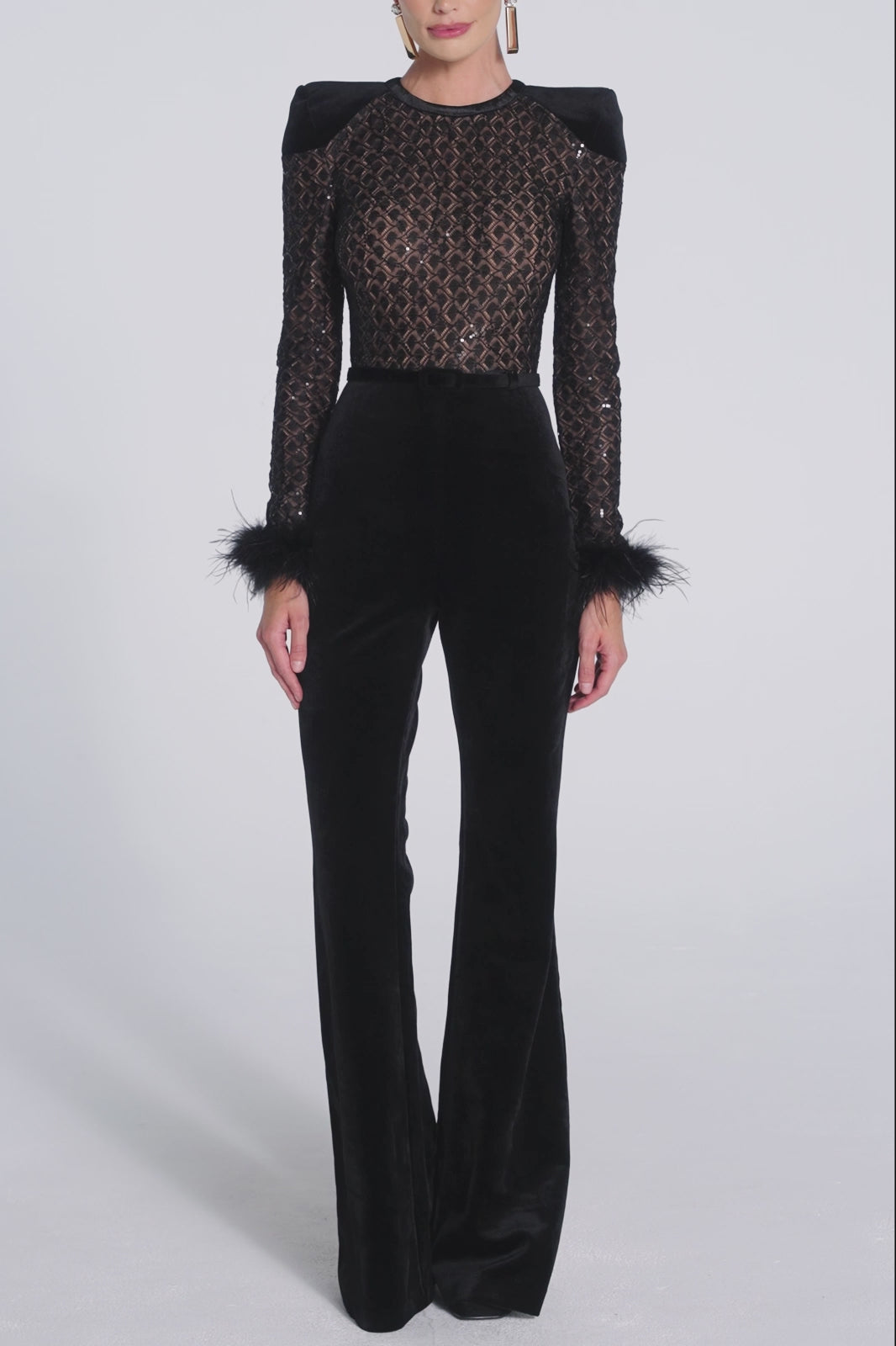 Make a statement in the MONIQUE Black Velvet Jumpsuit. Made from our exclusively designed lace and velvet, which is fully lined for a smooth fit. The nude lining of this black velvet long-sleeve jumpsuit provides coverage whilst accentuating the intricate lace detailing. This style looks equally as good paired with or without the belt.