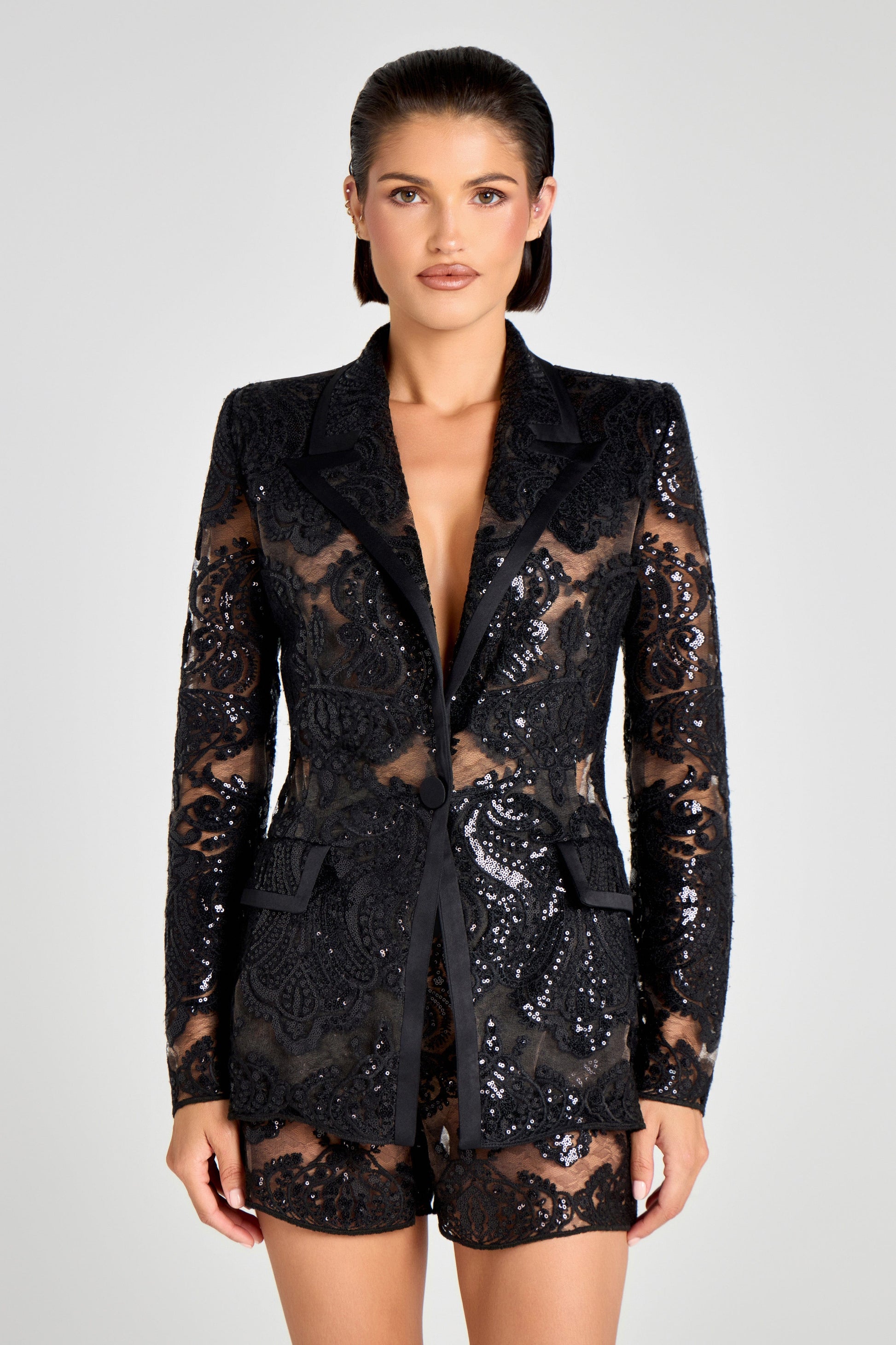Let the spotlight find you. PIPER Black Shorts are a standout design made to turn heads and spark compliments. Crafted from our structured black lace mesh, this style features a sequin-embroidered pattern that catches the light with every step. A sheer nude mesh lining offers a subtle hint of skin, while the scalloped hem introduces a touch of femininity, to balance the high-shine embellishment. Completed with a high-waisted silhouette and concealed zip closure for a smooth finish.