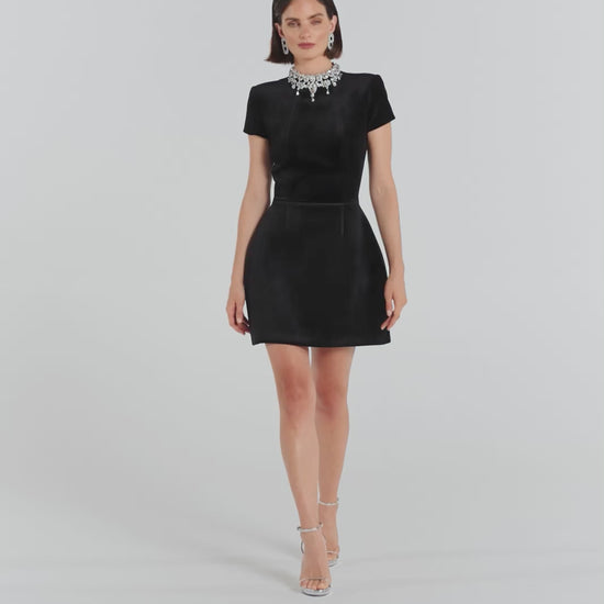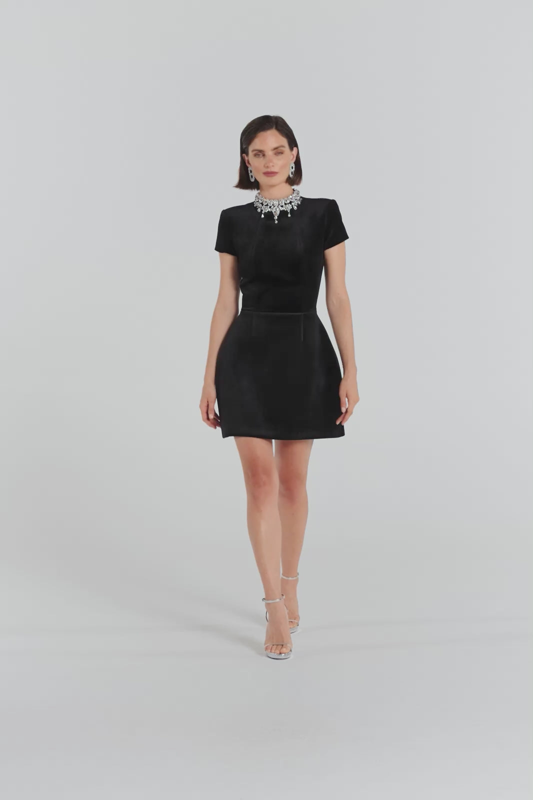 The REGAN Black Dress is crafted from our exclusively designed black velvet. This elegant mini dress features a high round neckline adorned with jewel-embellished trim. The contoured bodice is structured to flatter the silhouette, enhanced with internal shoulder pads and cap sleeves. Finished with our signature tulip-style mini skirt, functional side pockets, and a concealed back zip, REGAN is fully lined for a smooth, comfortable fit.
