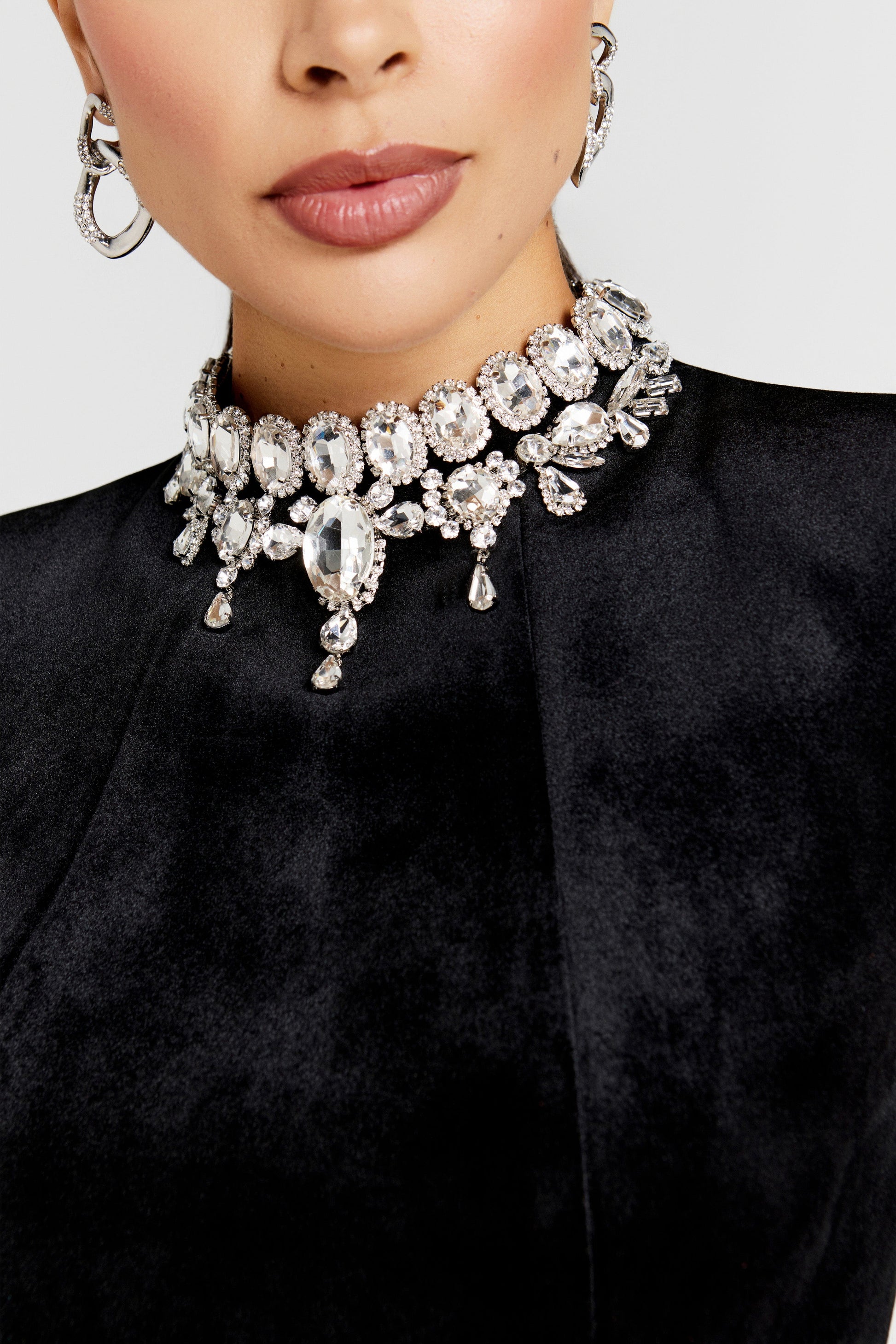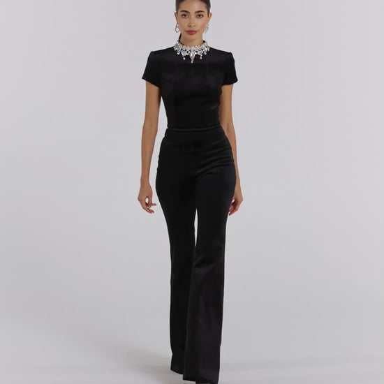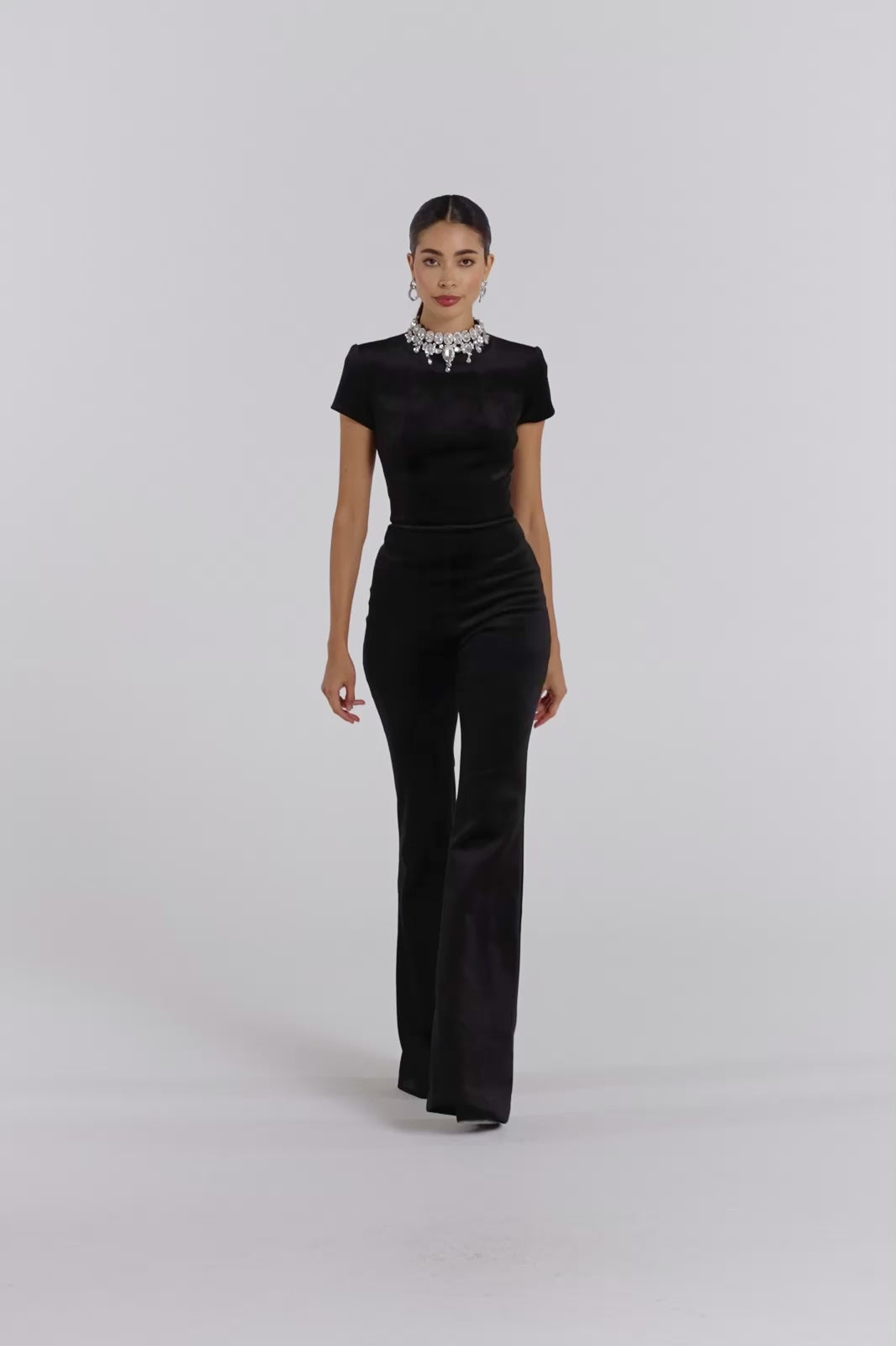 The REGAN Black Jumpsuit is crafted from our exclusively designed black velvet fabrication. This elegant jumpsuit features a high round neckline adorned with a jewel-embellished trim. The contoured bodice is structured to accentuate the silhouette, enhanced with internal shoulder pads and cap sleeves. Finished with our signature flared leg trousers and a concealed back zip closure, REGAN is fully lined for a smooth, comfortable fit.