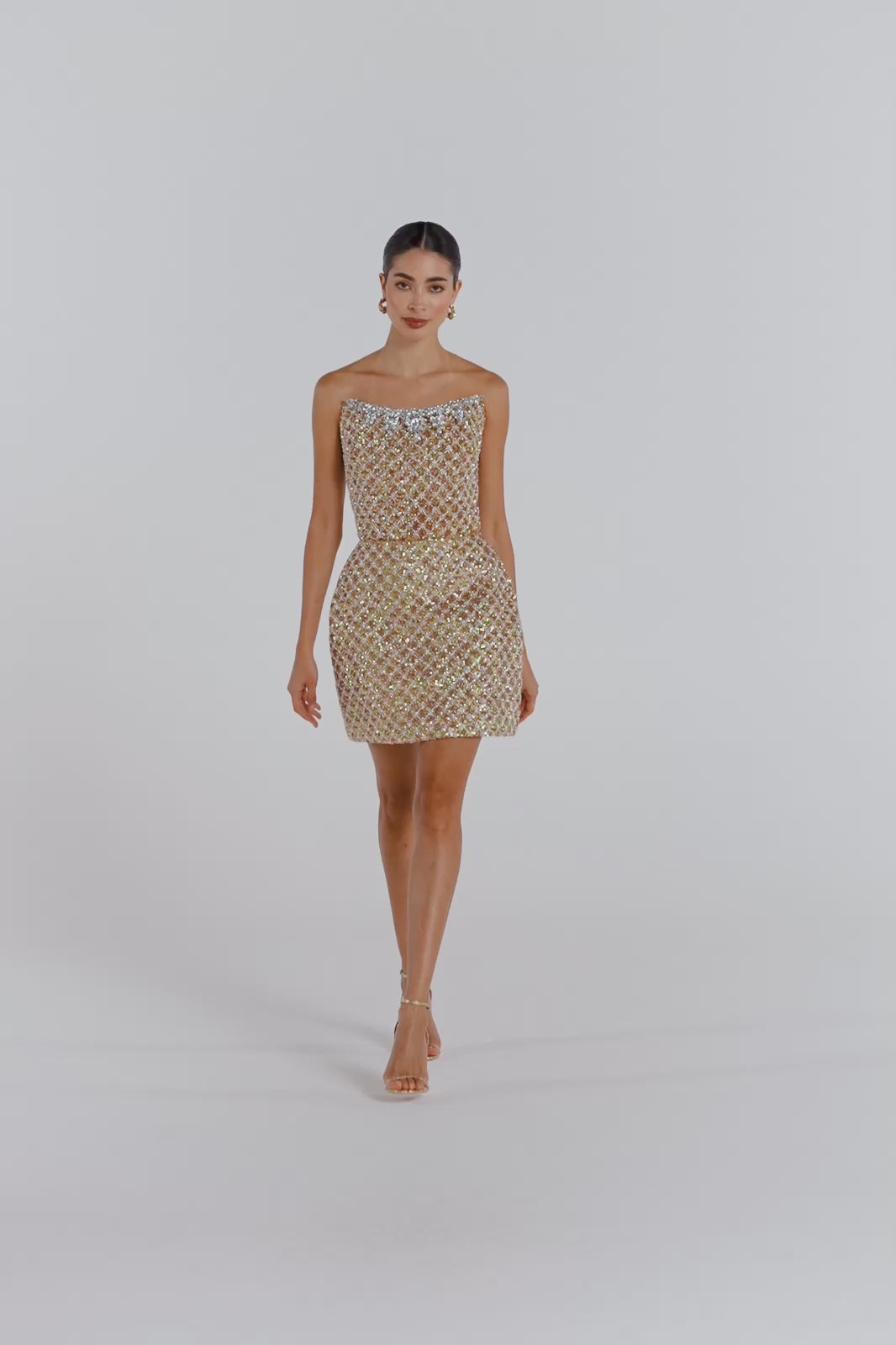 The SAVANNAH Gold Dress is crafted from luxurious gold sequin fabrication with a beaded embellished contrast silver overlay and features a structured bodice with boning at the front, back, and sides, paired with a signature tulip mini skirt. It is complete with a structured curved bandeau neckline with silver-encrusted droplet jewel trim and finished with a concealed zip closure at the back.
